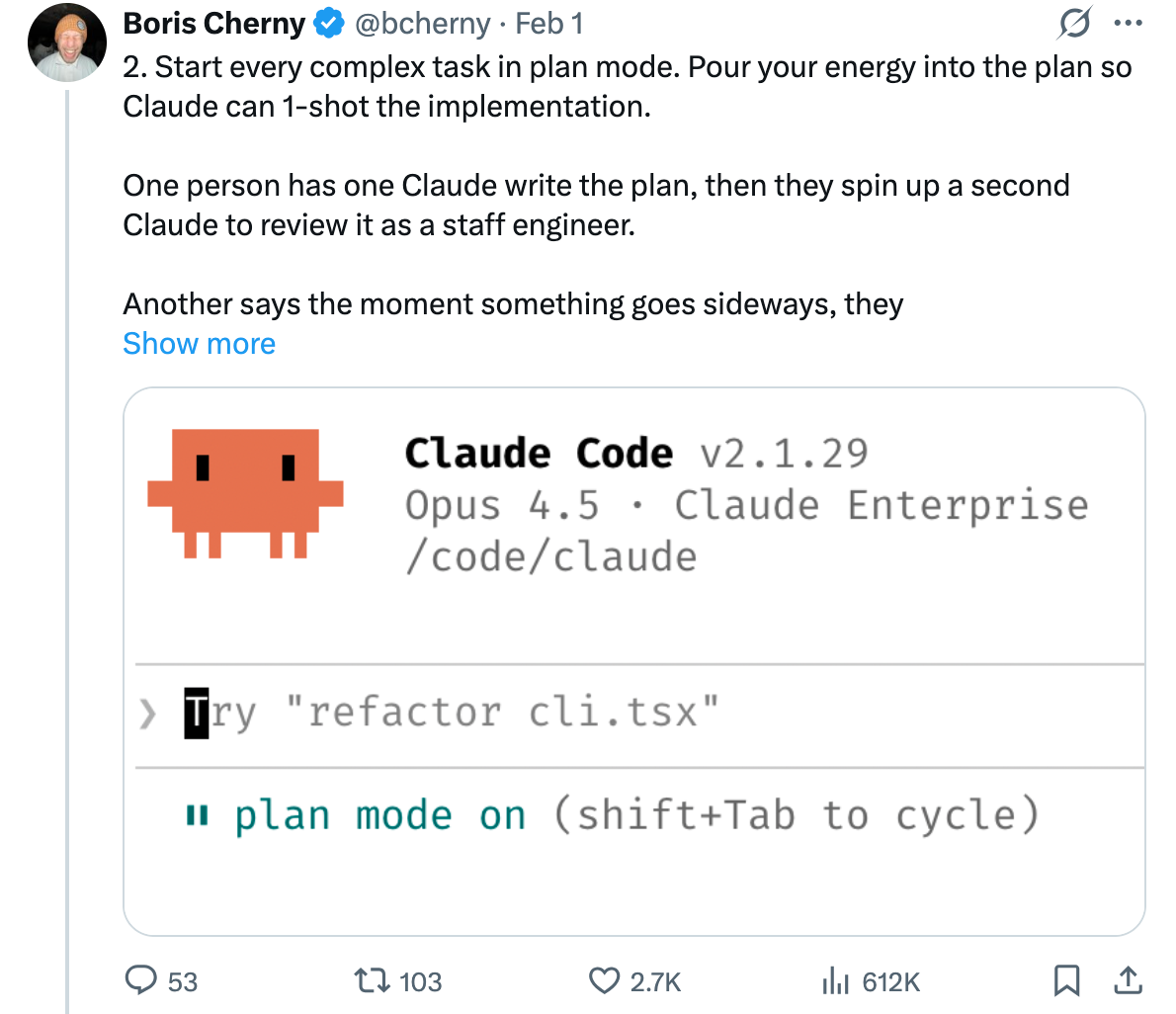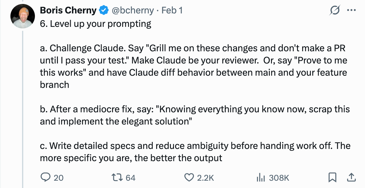 原文链接:https://x.com/bcherny/status/2017742741636321619
